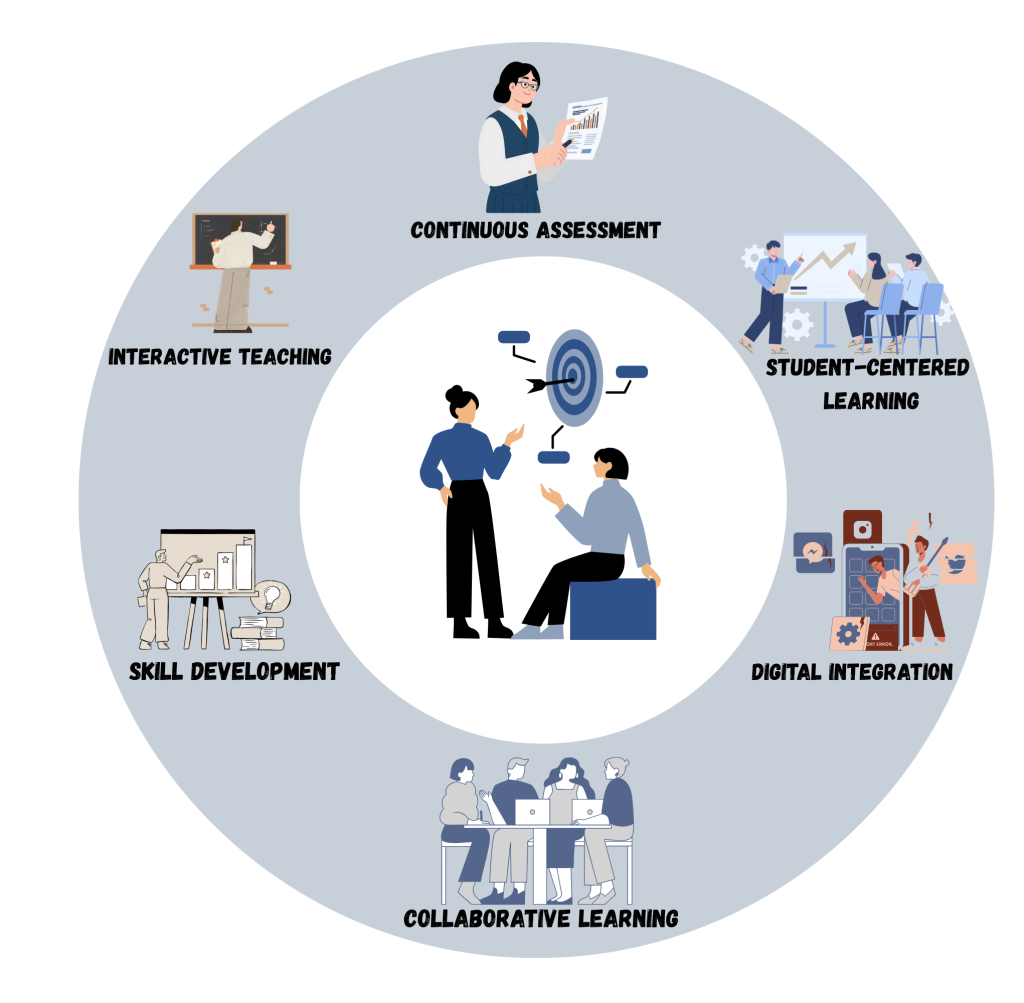 Our pedagogy focuses on a student-centered approach that makes learning simple, interactive, and meaningful. We encourage active participation and practical understanding so that students can clearly grasp concepts and apply them in real-life situations. With the support of modern teaching methods, continuous evaluation, and collaborative learning, we help students build strong knowledge, confidence, and essential skills required for their future success.